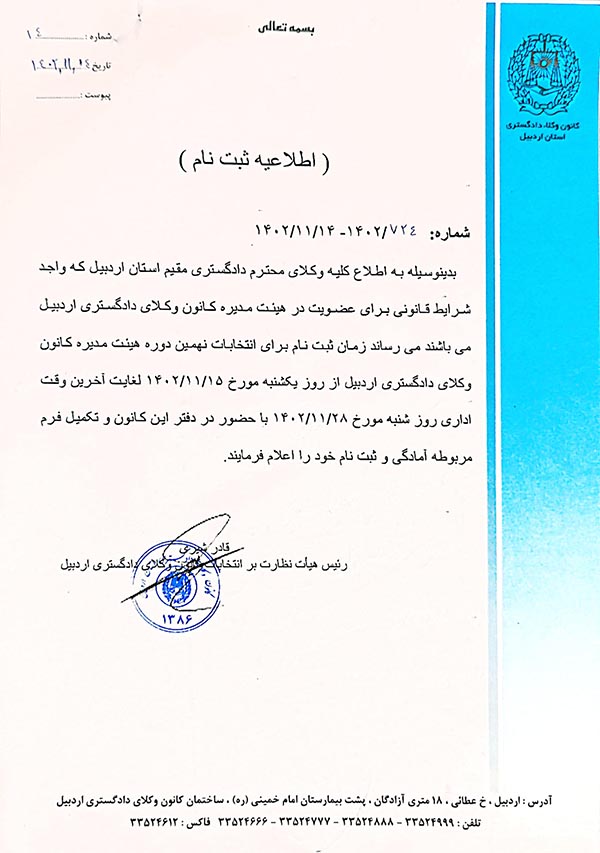 تصمیم هیات نظارت بر انتخابات در خصوص اعتراض بر نهمین دوره انتخابات هیات مدیره کانون وکلای دادگستری اردبیل